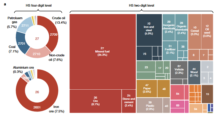 在HS 2位码级别的98个商品类别中,矿物燃料(HS 27)的国际货物运输贡献了35.3%的航运排放。HS 4位码级别的主要商品包括原油(HS 2709,占13.4%)、非原油(HS 2710,占7.6%)、煤炭(HS 2701,占7.1%)和石油气(HS 2711,占5.7%)。矿石(HS 26)也占全球航运排放的8.7%,其中大部分与铁矿石(HS 2601,占7.5%)有关。