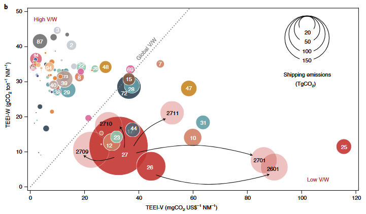 图3b解释了不同商品的贸易排放效率,每个商品的排放效率是所有贸易流涉及的该商品的全球航运排放总量与其总运输工作的比率。尽管以矿物燃料(HS 27)和矿石(HS 26)为主的散货商品对航运排放贡献很大,但其贸易排放效率(TEEI-W,大多数<30 gCO2吨-1 NM-1)低于大多数商品,因为这些散货产品通常由相对节能的散货船和油轮运输。然而,考虑到经济价值,其较低的单位价格无疑会导致较高的贸易排放效率(TEEI-V)。相比之下,由HS系统划分的制成品类别较为丰富,由于使用高能耗的集装箱船和滚装船运输(补充图2),其TEEI-W较高,而由于经济价值较高,其TEEI-V(大多数<20 mgCO2美元-1 NM-1)较低。