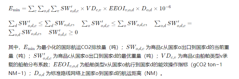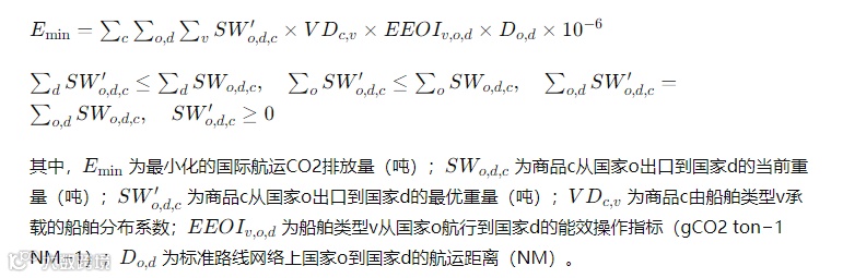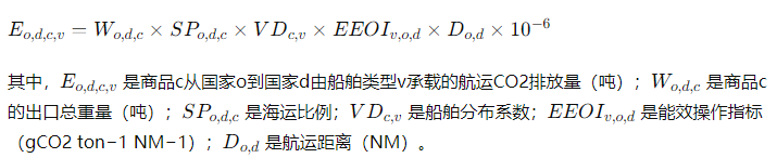 基于VoySEIM的双边贸易流和船队能效,GTEMS模型估算国际贸易关联的航运排放。模型假设海上商品在双边贸易路线上运输,公式如下: