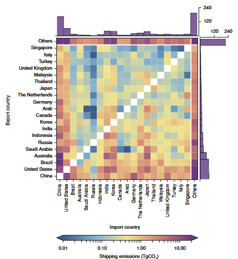 航运减排的宏伟目标和机制设计的挑战需要新的方法来鼓励脱碳。在这里,我们构建了一个复合模型链,将全球国际航运排放解构为精细化贸易流,并提出与贸易相关的指标来衡量航运排放效率。2018 年国际海运贸易对航运二氧化碳排放量贡献了 746.2Tg,其中 17.2%来自于国家层面的千分之十的贸易流量。我们认为,如果由于外部受益人而将航运排放责任分配给双边贸易商,则存在潜在的不公平。但通过优化国际贸易格局,航运减排潜力巨大,最高可达目前总量的 **38%**。我们的综合建模系统可以作为基准工具,支持构建系统解决方案以及航运业和全球贸易网络共同应对气候变化。