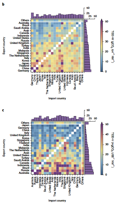 图2b、c展示了TEEI-W(gCO2 ton−1 NM−1)和按价值计算的贸易排放效率指数(TEEI-V;mgCO2 US-1 NM-1),用于理解双边层面的贸易相关航运排放效率。由于国际贸易结构和船舶运营效率的异质性,不同双边排放流之间的TEEI-W差异达到38倍。高TEEI-W的国家多使用高排放船舶运输。从经济价值而非重量来看,不同双边对的TEEI-V差异高达数千倍(0.18-65.6 mgCO2 US$ −1 NM−1),全球平均每海里每美元贸易排放15.6毫克二氧化碳。虽然澳大利亚和巴西的TEEI-W较低,但由于出口的大量低成本高重量商品,其TEEI-V却显著较高。考虑到计算TEEI-W和TEEI-V的数据获取问题,这些指标的全球和双边值在此提供以供潜在应用。通过这些多尺度指标,经济、航运和大气之间的关联难题大大简化。