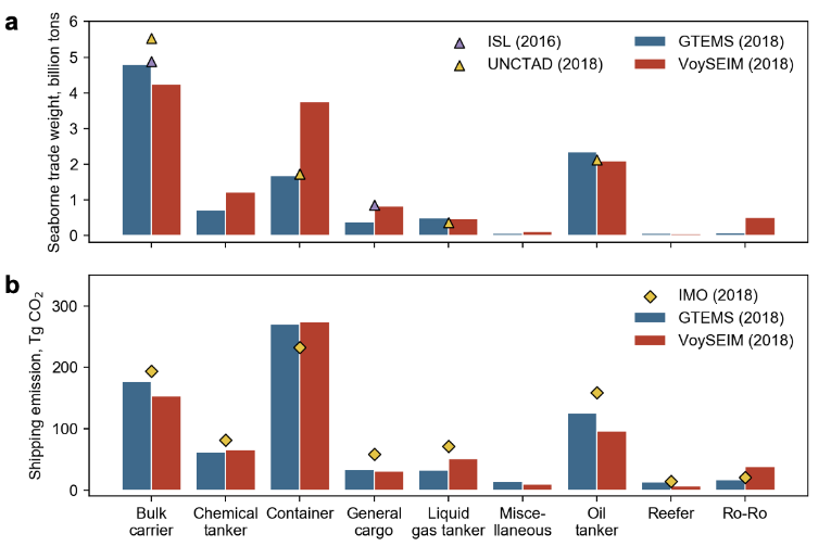 (3)排放结果验证 GTEMS和VoySEIM的全球航运排放结果按船舶类型分类,与IMO最新评估的类似航程方法相似(补充表1和补充图10)。在更细的尺度上,通过与巴西出口案例研究比较,双边和商品层面的航运排放结果也得到了验证(补充图11)。