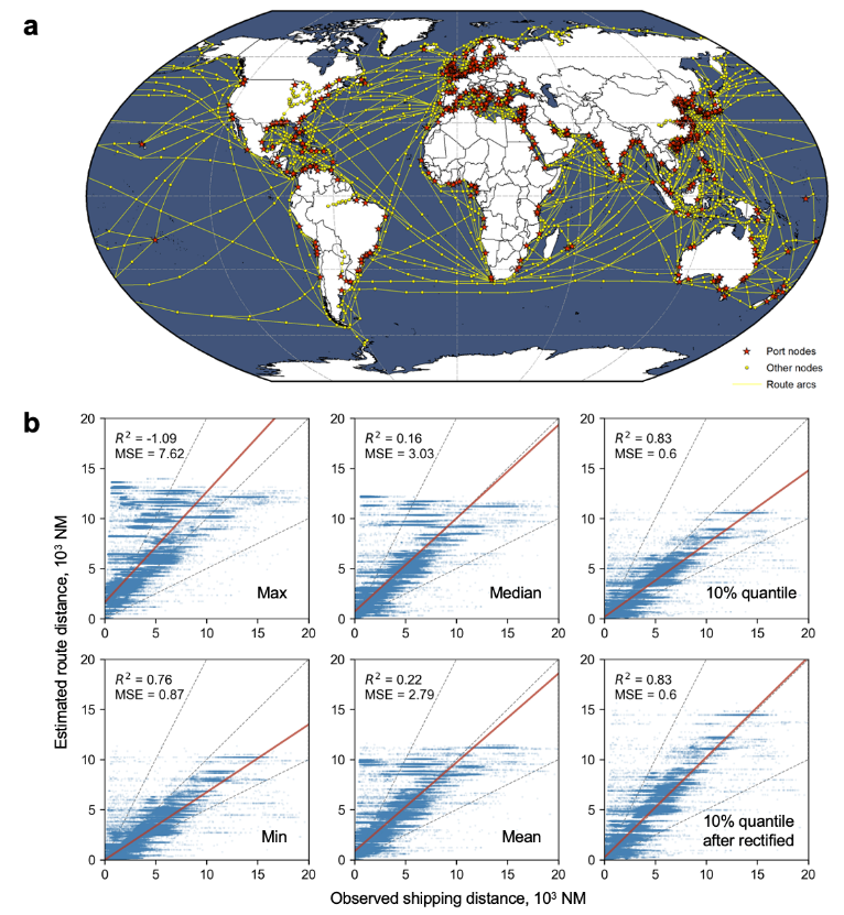 (3) 运输航线距离。从AIS数据中提取空间信息,开发全球航运路线网络,模拟双边路线距离。使用Dijkstra最短路径算法计算港口间最短路线,共246,017条。考虑到贸易国家通常有多个港口,采用简单平均可能会对如美国、加拿大和俄罗斯等国家带来偏差。通过比较Dijkstra算法估算的双边路线距离与VoySEIM计算的观察到的航程距离,进行多次测试,测试结果显示最佳的决定系数(R² = 0.83)和均方误差(MSE= 0.60)在10%分位数时获得。最终对这些偏差进行校正,假设不同贸易对之间的平衡。