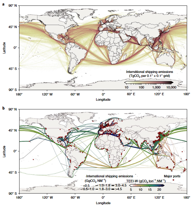 为了进一步解释贸易关联航运排放特征,引入了按重量计算的贸易排放效率指数(TEEI-W;gCO2 ton-1 NM-1),以显示所有运输商品单位距离的航运排放量。不同于描述每艘船舶单次航程的EEOI,TEEI-W从贸易角度展示了排放效率,考虑了双边贸易量和结构以及确定的船队规模和航程构成。数百万次航运航程具有不同的EEOIs,从数千个沿海港口出发,汇集在主要航线上,最终导致不同航线上航运排放强度和贸易排放效率的异质性(图1b)。