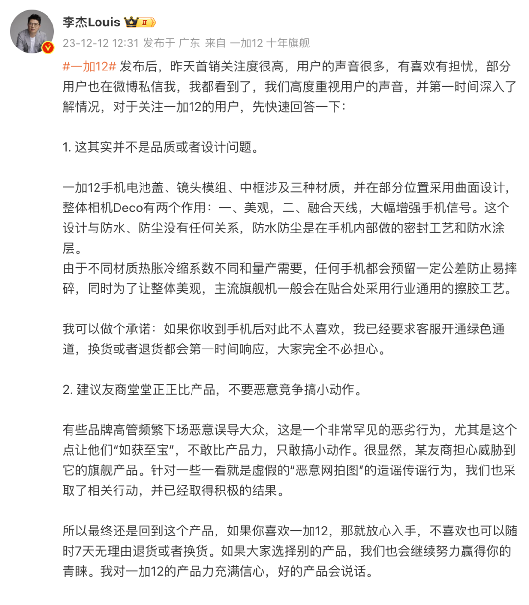 作为补充,早前一加中国区总裁李杰曾在微博称建议堂堂正正比产品,不要恶意竞争搞小动作。并称针对一些一看就是虚假的“恶意网拍图”的造谣传谣行为采取了相关行动,并已经取得积极的结果。这波大家怎么看?