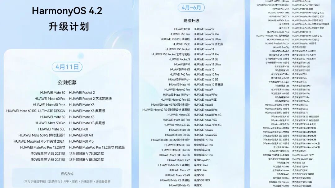 昨天下午,华为举行了鸿蒙生态春季沟通会,在发布会尾声,余承东表示鸿蒙原生应用已经4000+,并预告华为将于6月举行HDC开发者大会,鸿蒙星河版将正式开启Beta,随后官方也更新了HarmonyOS 4.2的升级计划,来看看有没有你的设备~