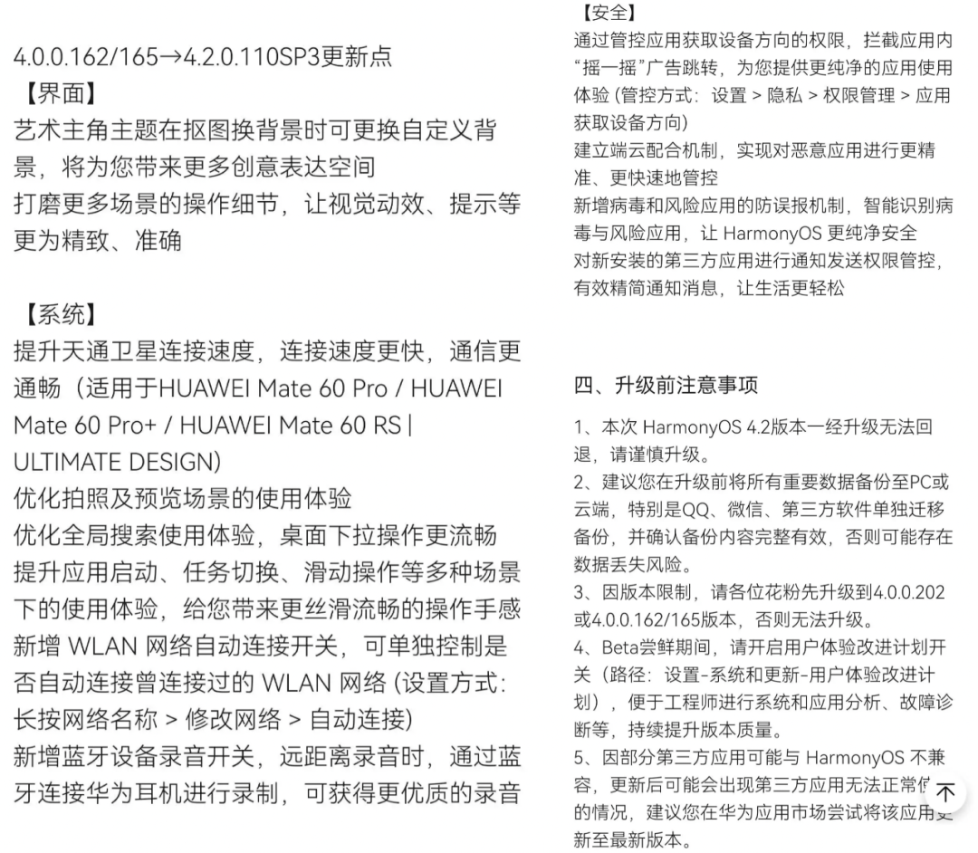 据了解,这次具体更新的内容有很多,Mate 60 Pro系列机型更新公测后提升天通卫星连接速度,连接速度更快、通信更通畅;另外通过管控应用获取设备方向的权限,拦截应用内“摇一摇”广告跳转(管控方式:设置-隐私-权限管理-应用获取设备方向)。华为用户可以来聊聊目前的系统版本体验如何~