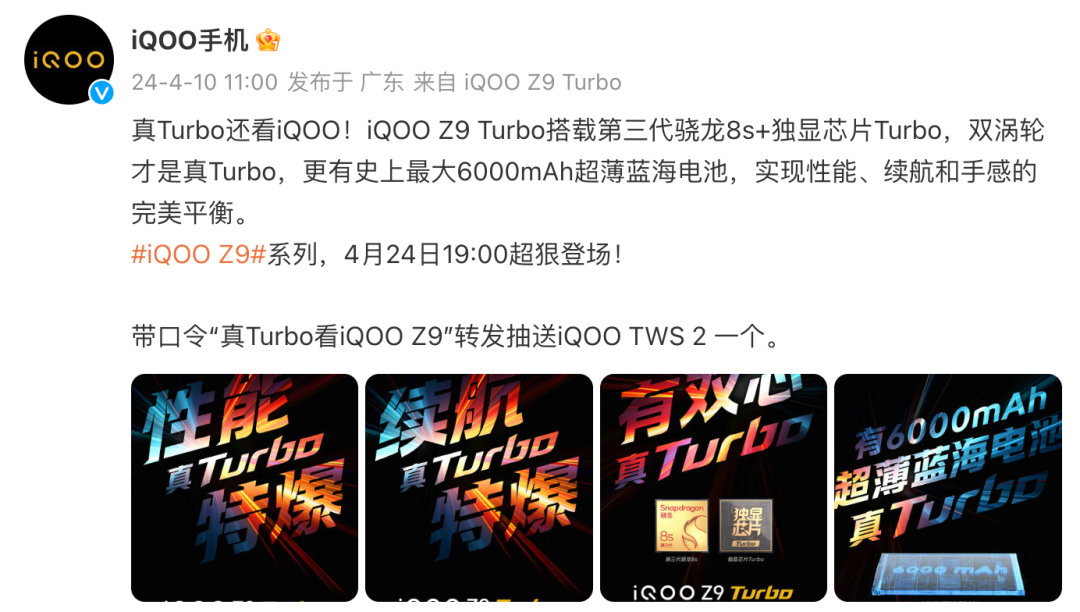 据官方宣布,iQOO Z9系列将于4月24日19点发布。目前预热的主要机型是iQOO Z9 Turbo,核心卖点有:1.5K 144Hz屏,机身厚度7.98mm,重量1xxg,首批搭载骁龙8s Gen3,配备6000mAh蓝海大电池,6K VC散热、独显芯片Turbo。