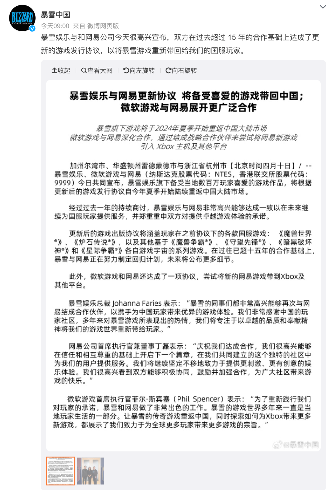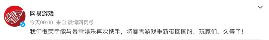 另一边,今日暴雪娱乐、微软游戏与网易共同宣布,暴雪娱乐旗下游戏作品,将根据更新后的游戏发行协议自今年夏季开始陆续重返中国大陆市场。