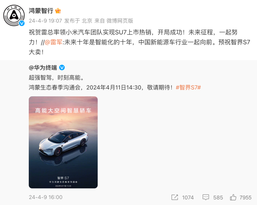昨天晚上,鸿蒙智行官方微博也转发了雷军的微博,并回应称「祝贺雷总率领小米汽车团队实现SU7上市热销,开局成功!未来征程,一起努力!」。这两波联动可以说是格局打开了~