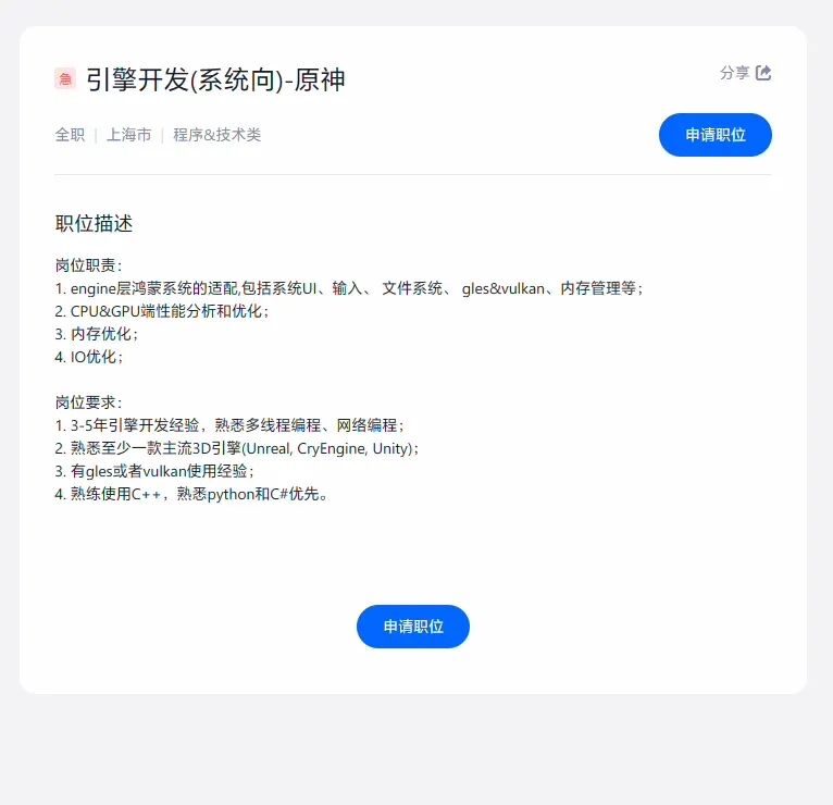 另据爆料,《原神》也在推进鸿蒙原生应用,最近米哈游官网在线招聘:引擎开发(系统向)-原神。岗位职责显示,该岗位涉及engine层鸿蒙系统的适配,包括系统UI、输入、 文件系统、 gles&vulkan、内存管理等项目,还有 CPU&GPU端性能分析和优化、内存及IO的优化。