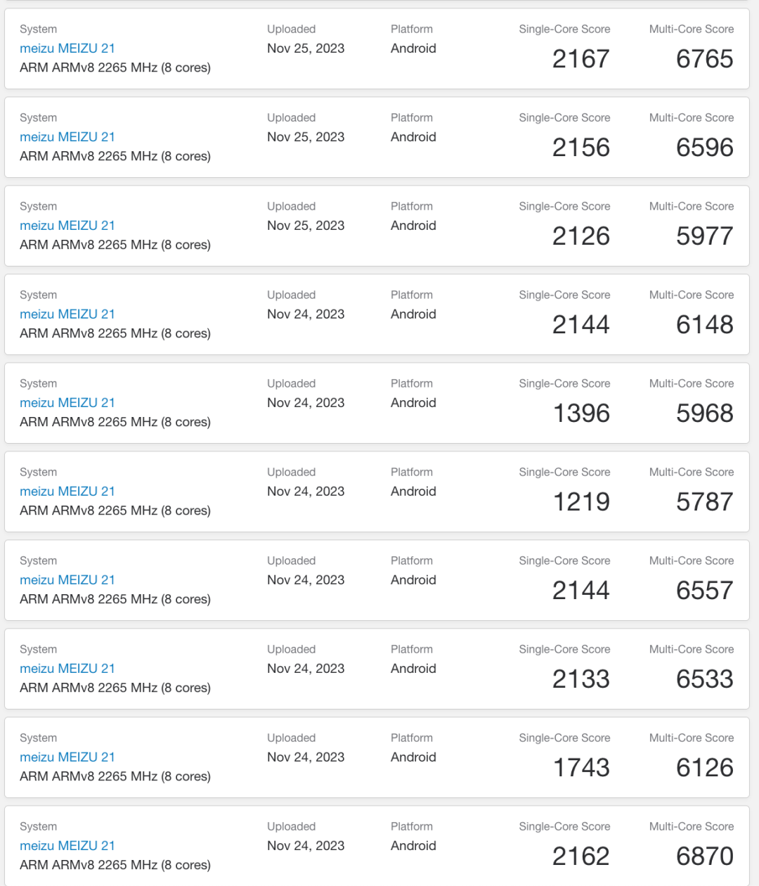 如上图所见,魅族21应该是已经开始测试,后台有多组跑分,目前单核最高2167,多核最高6870。