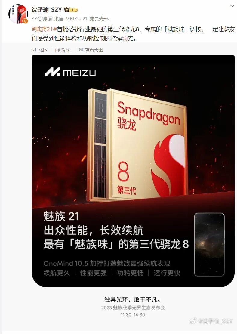 星纪魅族CEO沈子瑜还表示魅族21将是最有「魅族味」的骁龙8 Gen3,拥有专属的「魅族味」调校,性能体验和功耗控制持续领先(这条微博目前已不可见)。