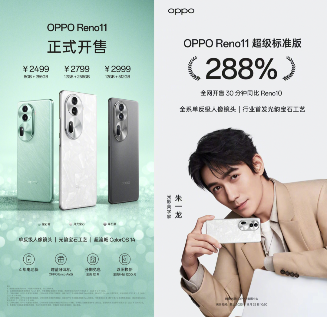 本周四OPPO发布了新一代Reno,更新了Reno 11和Reno 11 Pro两款新机,昨日迎来首销,官方也更新了战报。(戳👆🏻蓝字部分可回顾具体配置及价格)