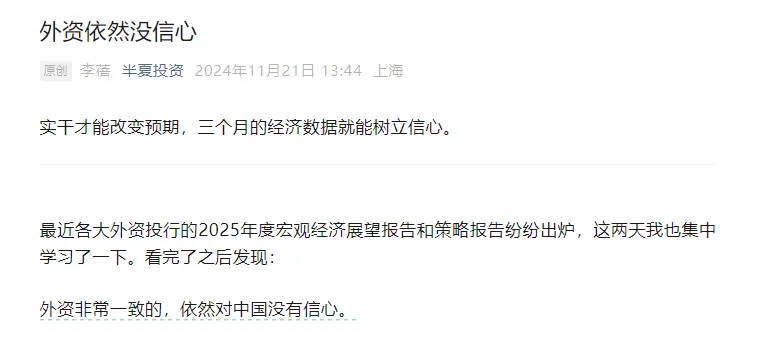 知名私募人士李蓓周四发文总结近期外资机构研报中对于A股的看法,表达了一定悲观情绪。同时建议政策进一步发力刺激经济,才能吸引外资进入。