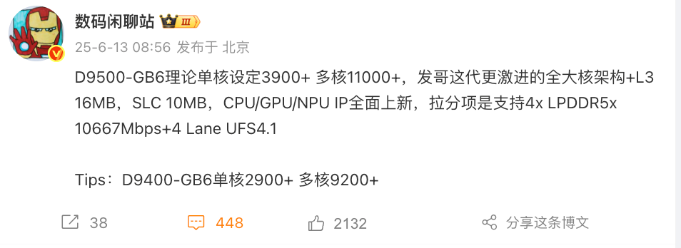 最近高通官宣将于9月23日-25日举行2025骁龙峰会,也就是说骁龙8 Elite2将在9月和我们见面,而联发科这边新一代旗舰SoC——天玑9500大概率也是差不多时间,现在有更多参数曝光。