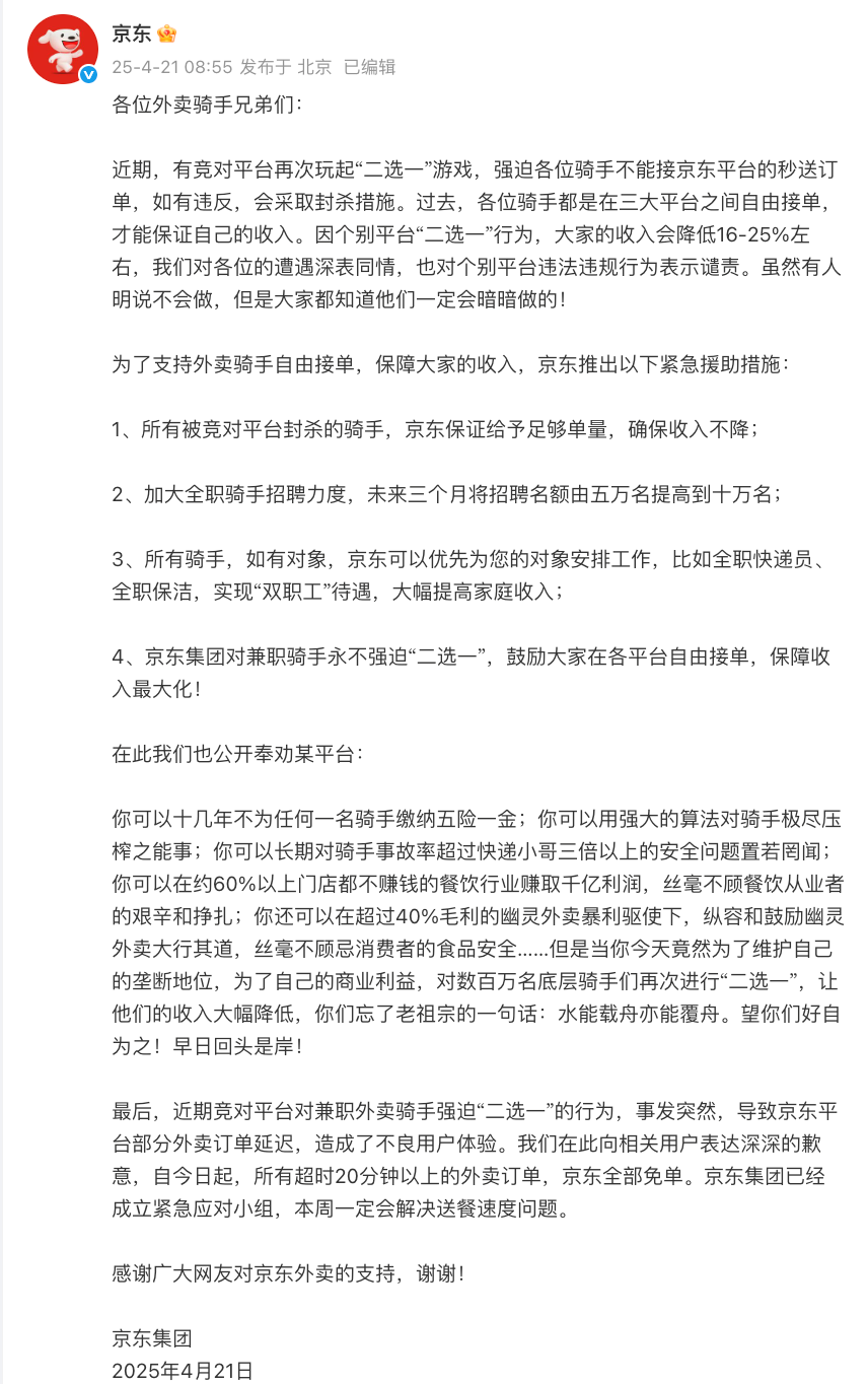 近期竞对平台对兼职外卖骑手强迫“二选一”的行为,事发突然,导致京东平台部分外卖订单延迟,造成了不良用户体验,在此向相关用户表达深深的歉意,自今日起,所有超时20分钟以上的外卖订单,京东全部免单。京东集团已经成立紧急应对小组,本周一定会解决送餐速度问题。