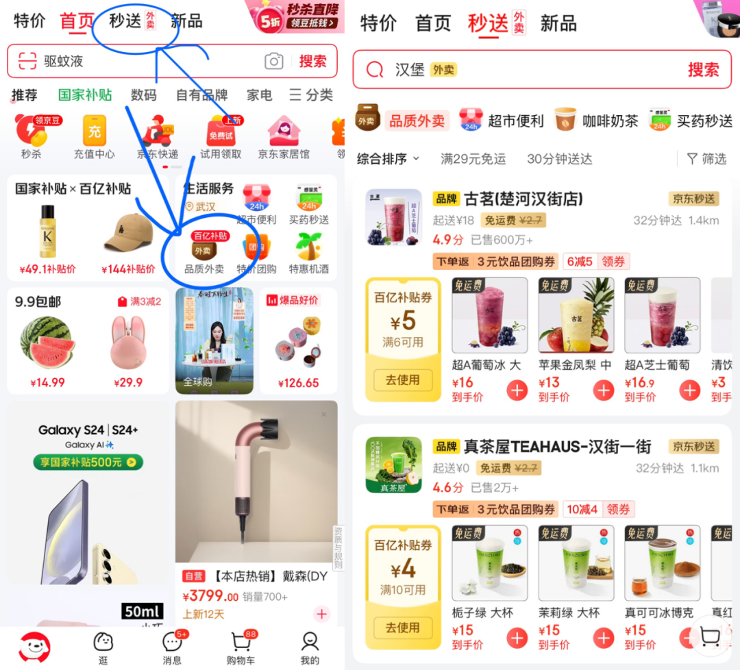 2025年2月,京东正式上线京东外卖服务(在京东App首页点击顶部的“秒送”或者首页右侧的“品质外卖”即可进入),随后业务范围和覆盖城市迅速扩大,京东官方也为外卖骑手推出了一系列政策(比如