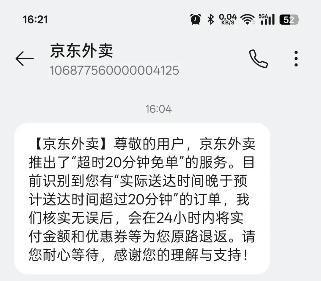 说来也巧,今天我们工作室小伙伴用京东外卖就碰上了超时20分钟,然后收到了官方发来的短信,预计审核无误后会原路退返订单的实付金额和优惠券,不得不说这波挺猛~