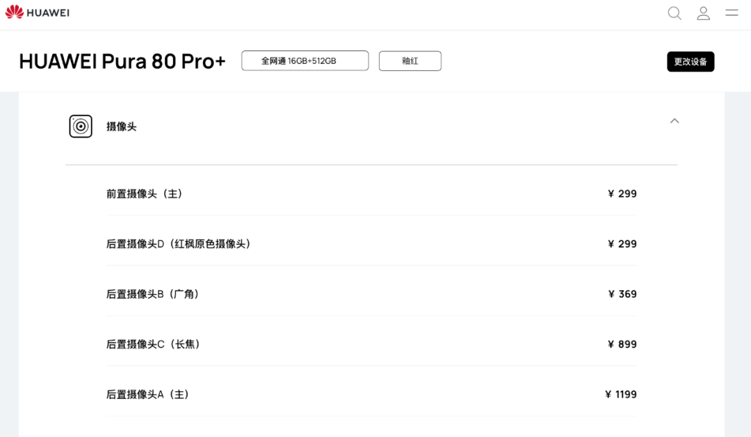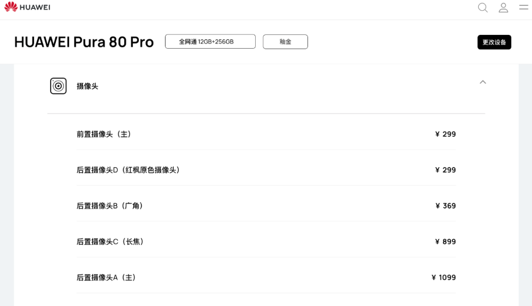 至于Pura 80 Pro+和Pura 80 Pro镜头规格基本一致:前置299元,超广角369元,长焦899元,红枫原色摄像头299元。两款型号区别在于主摄,具体Pura 80 Pro+的主摄保外维修备件价格是1199元,Pura 80 Pro主摄是1099元。