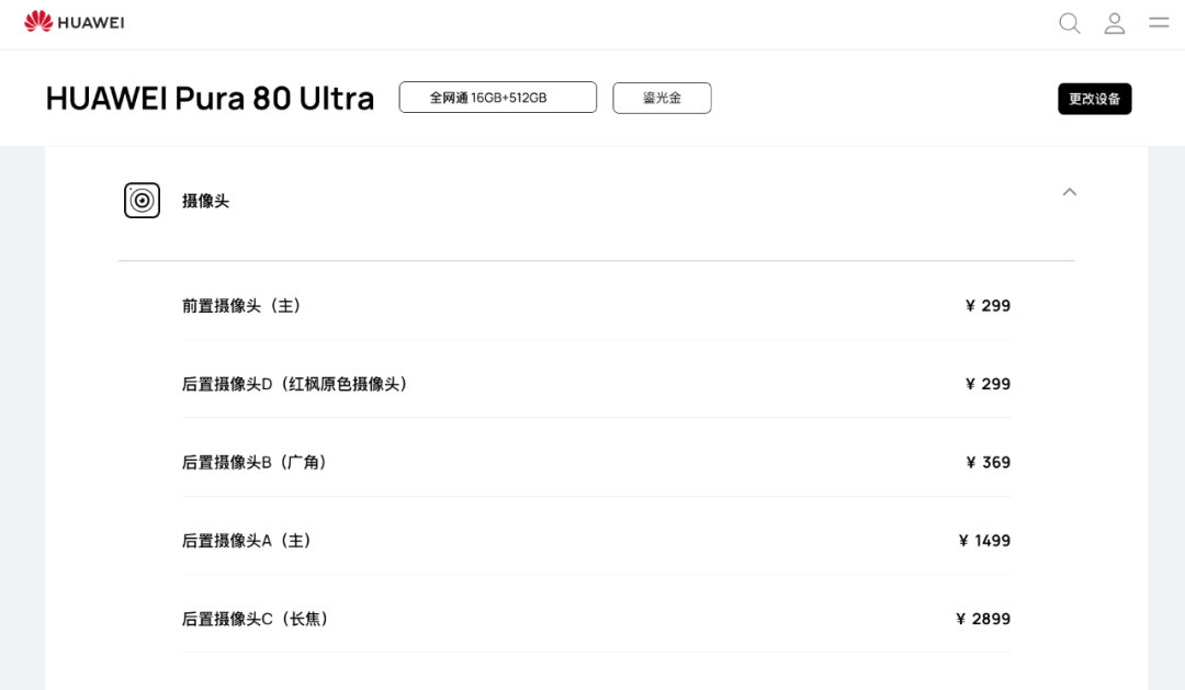 如上图所见,首先是华为Pura 80 Ultra的官网保外维修备件价格:后置主摄1499元,长焦模组2899元,超广角369元,红枫原色摄像头299元,前置299元。