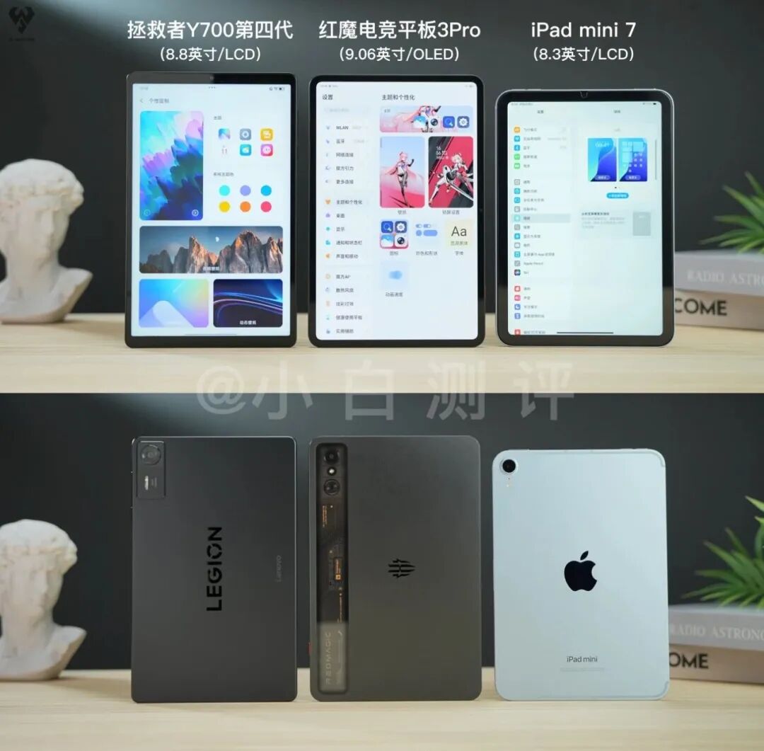 这里附上红魔电竞平板3 Pro和友商同类小平板iPad mini 7和拯救者Y700第四代放在一起的对比图,供大家参考尺寸,iPad mini 7是三台中机身最宽的。