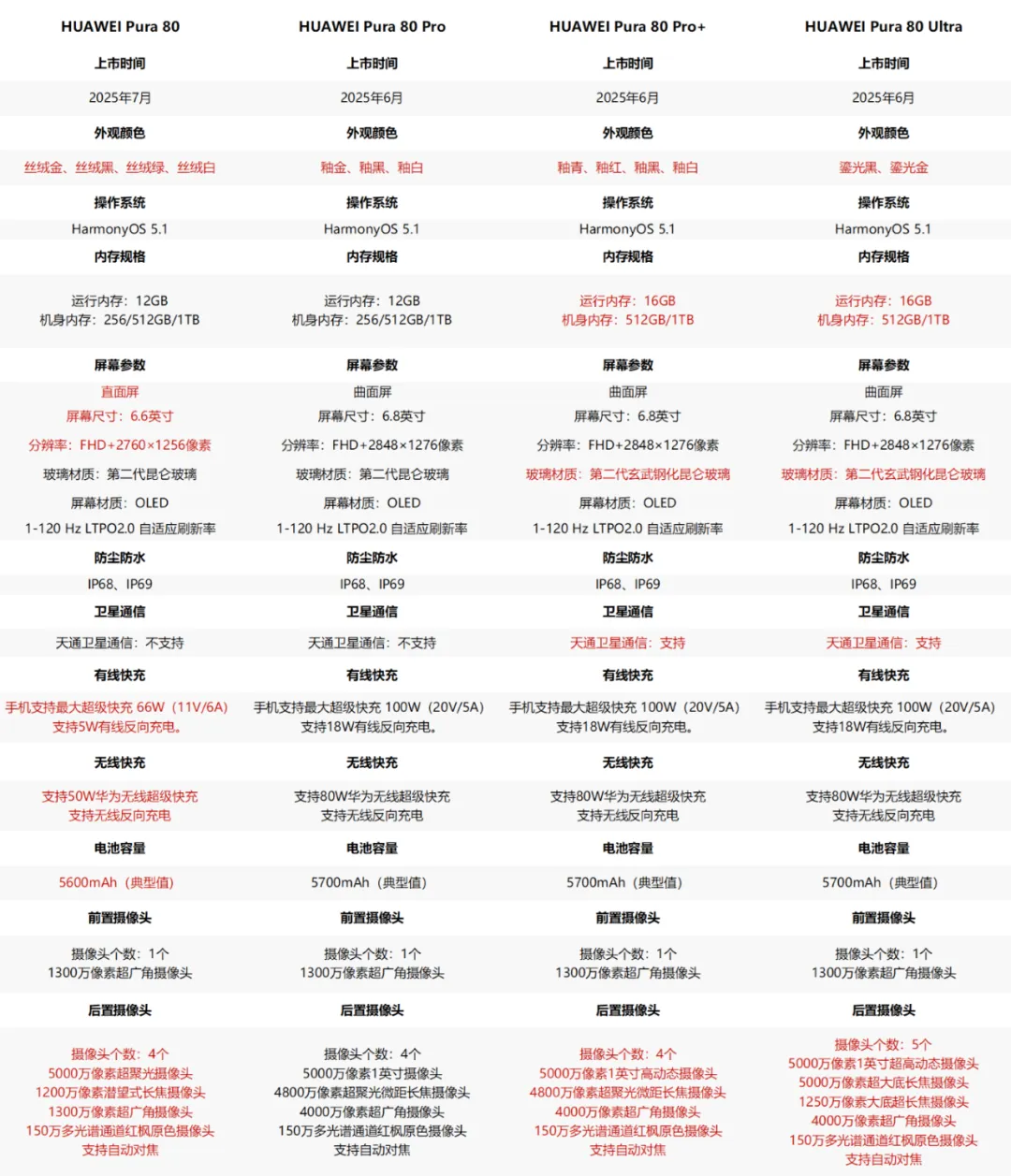 再附上官网给出的Pura 80系列四款型号主要参数对比表,供大家综合对比~