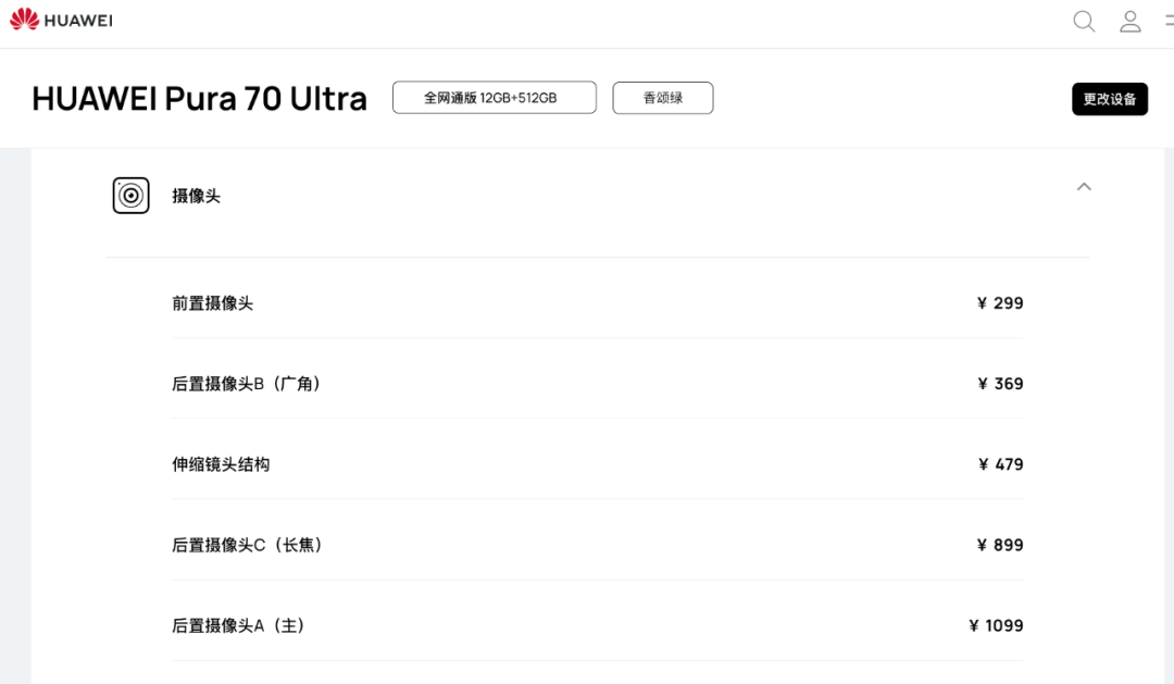 这里也附上上代华为Pura 70 Ultra的镜头维修价格,可以看到主摄1099元、伸缩镜头结构479元,超广角369元,长焦899元,前置299元。