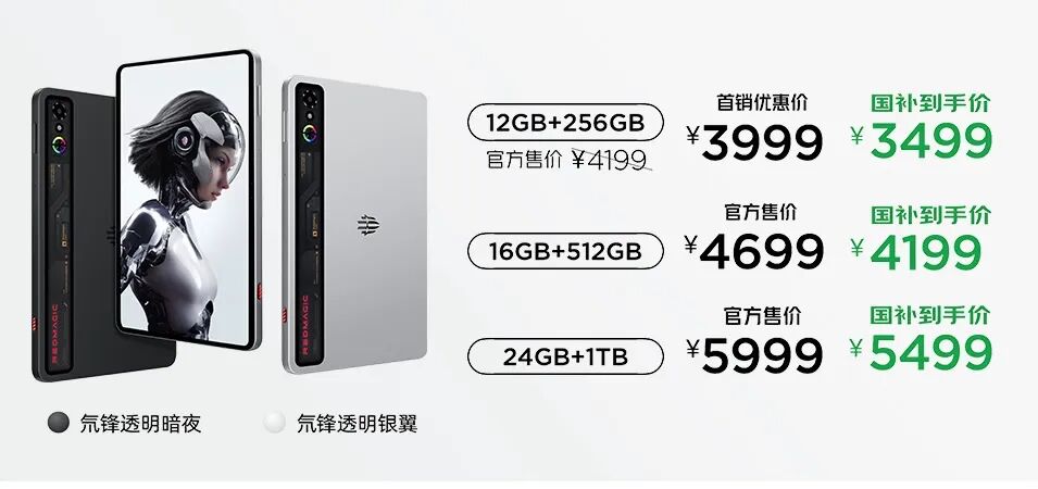价格上,【红魔电竞平板3 Pro】12+256GB版售价4199元、首发3999元(国补后3499元),16+512GB版4699元(国补后4199元),24GB+1TB版5999元(国补后5499元),首批开卖仅暗夜1个配色。
