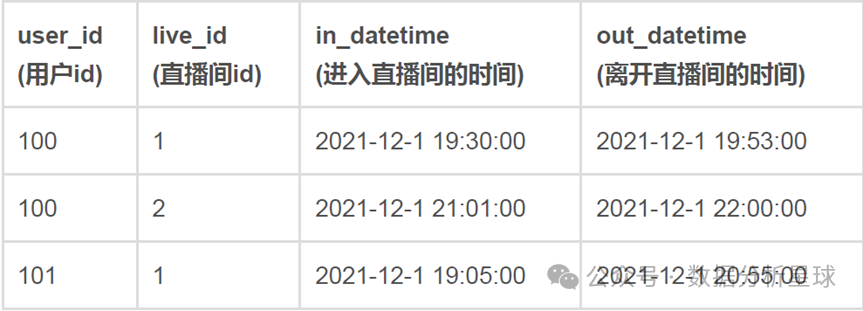 SELECT live_id, MAX(ct) AS max_user_countFROM (SELECT live_id, dt, SUM(flag) OVER(PARTITION BY live_id ORDER BY dt ASC) AS ctFROM (SELECT live_id, in_datetime AS dt, 1 AS flagFROM live_eventsUNION ALLSELECT live_id, out_datetime AS dt, -1 AS flagFROM live_events) t1) t2GROUP BY live_id;