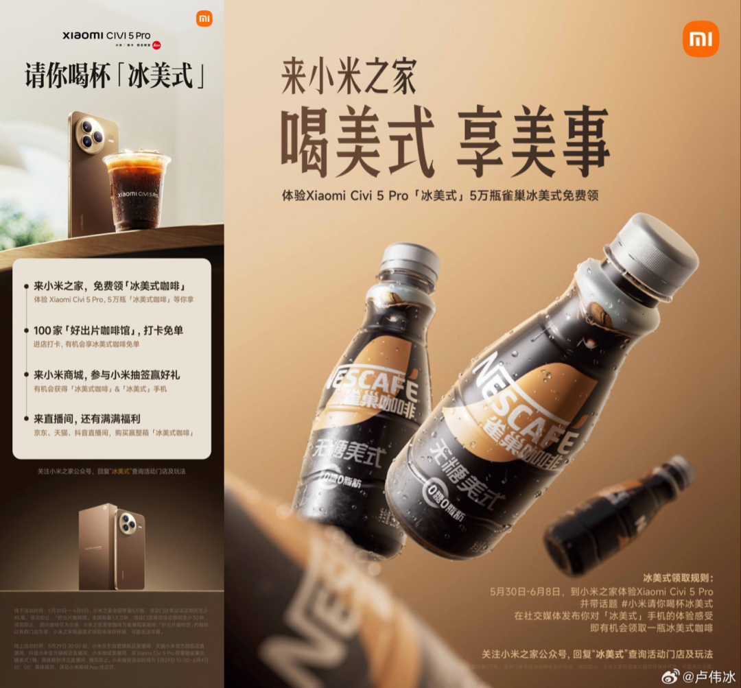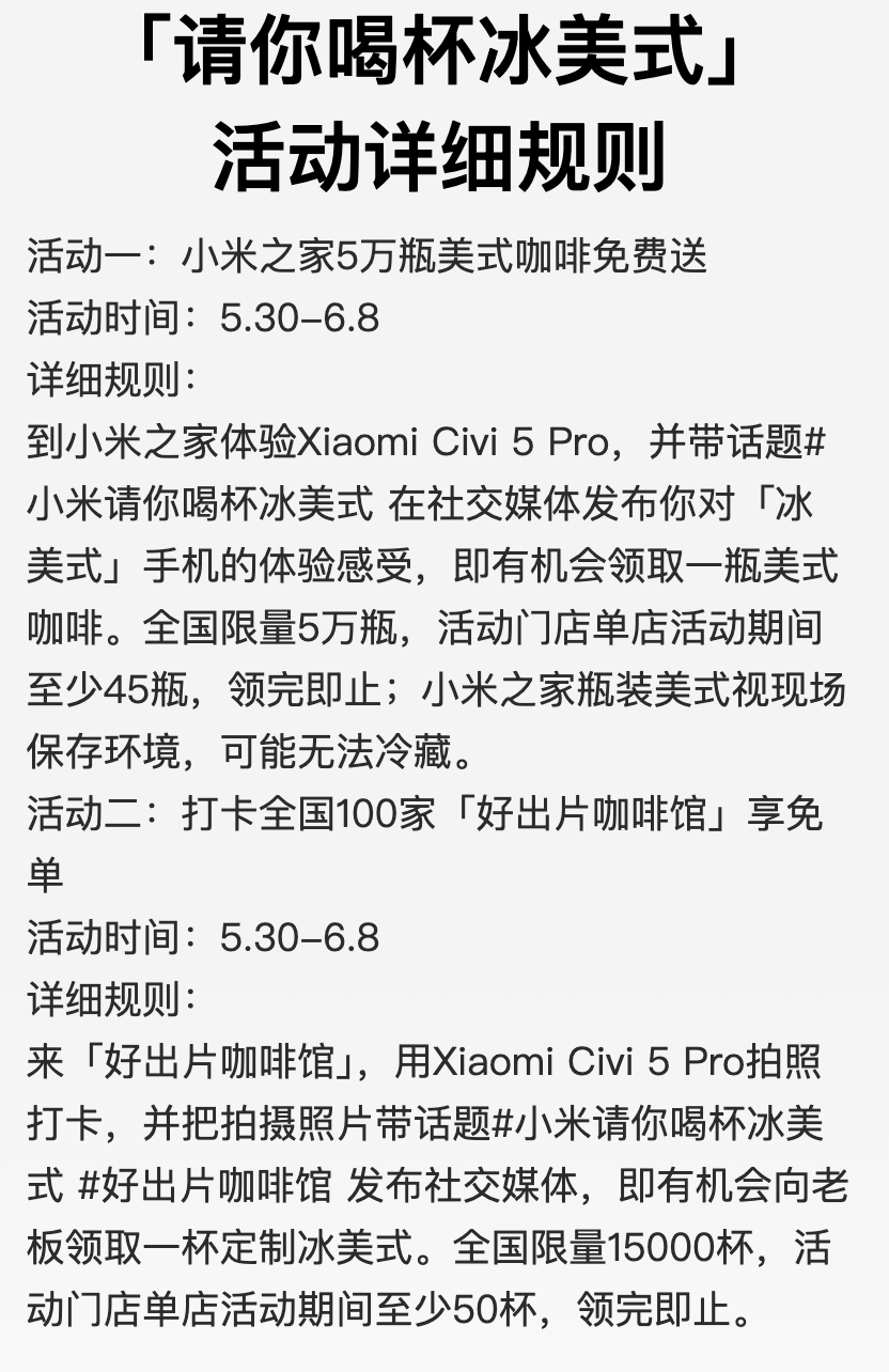 据了解活动现已开启、截至6月8日,官方称活动期间到小米之家体验小米Civi 5 Pro手机,并在社交媒体晒图即可获得冰美式咖啡。活动门店单店活动期间至少45瓶,领完即止。