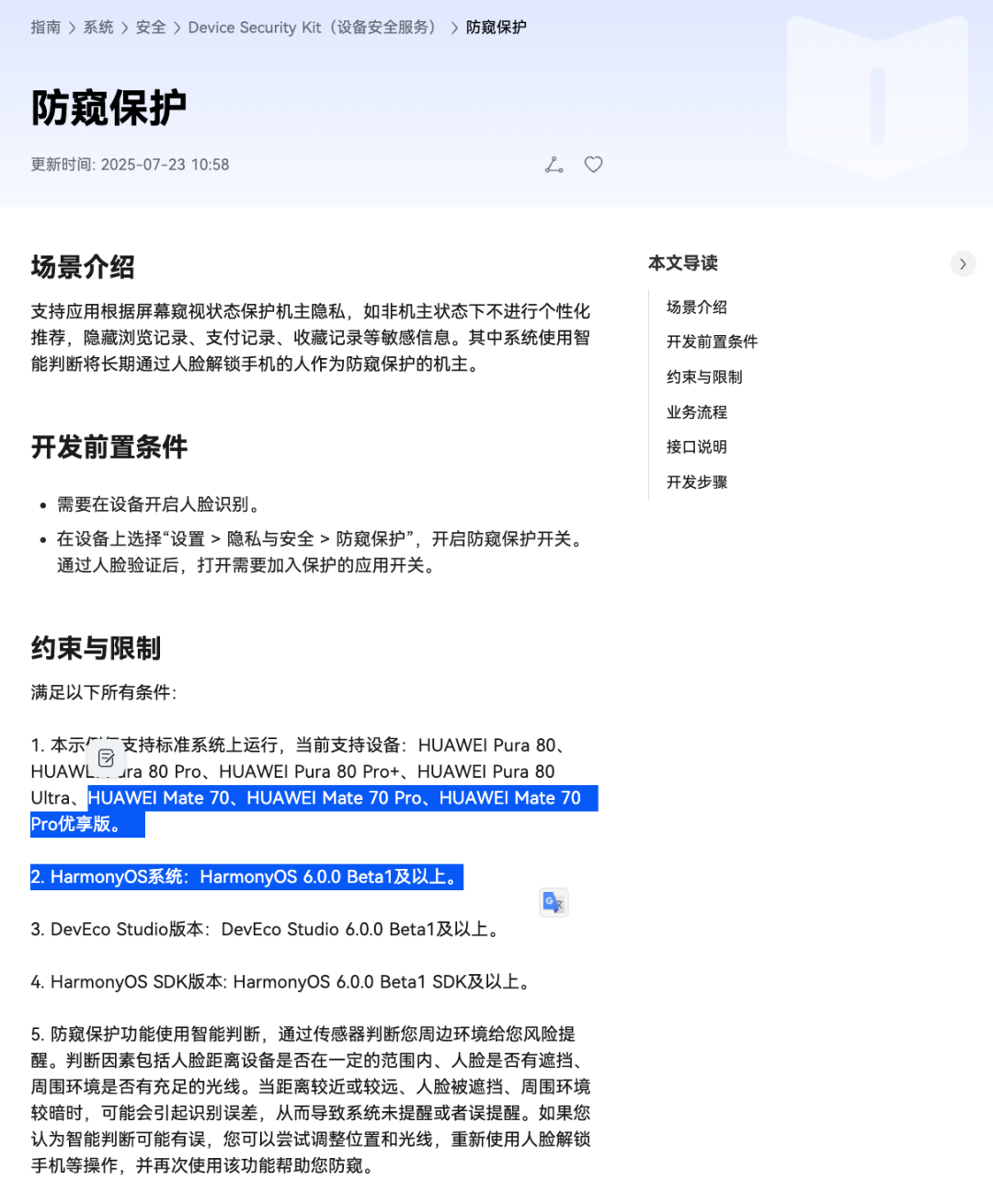 现据IT之家报道,华为鸿蒙HarmonyOS开发者官网今日更新的开发文档中显示:“防窥保护”功能支持设备除Pura80系列外,还将支持Mate 70、Mate 70 Pro、Mate 70 Pro优享版机型,但系统版本限制条件为HarmonyOS 6.0.0 Beta1及以上。换言之就是AI防窥保护功能Mate 70系列应该也会有,但可能要等到鸿蒙6版本才会适配完成推送。
