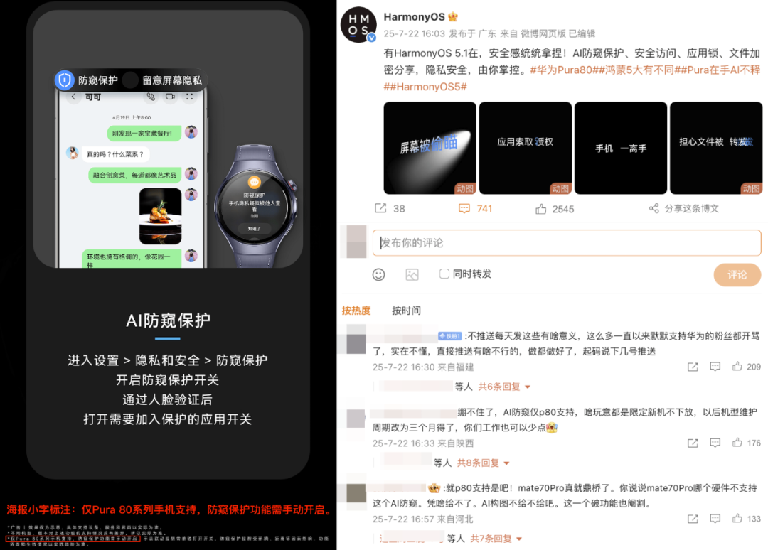 最近HarmonyOS官方微博在宣传鸿蒙5.1的AI防窥保护功能时,评论区还有不少用户催更鸿蒙5.1推送,以及询问Pura 80系列的一些功能比如AI防窥保护功能Mate 70系列是否会支持。