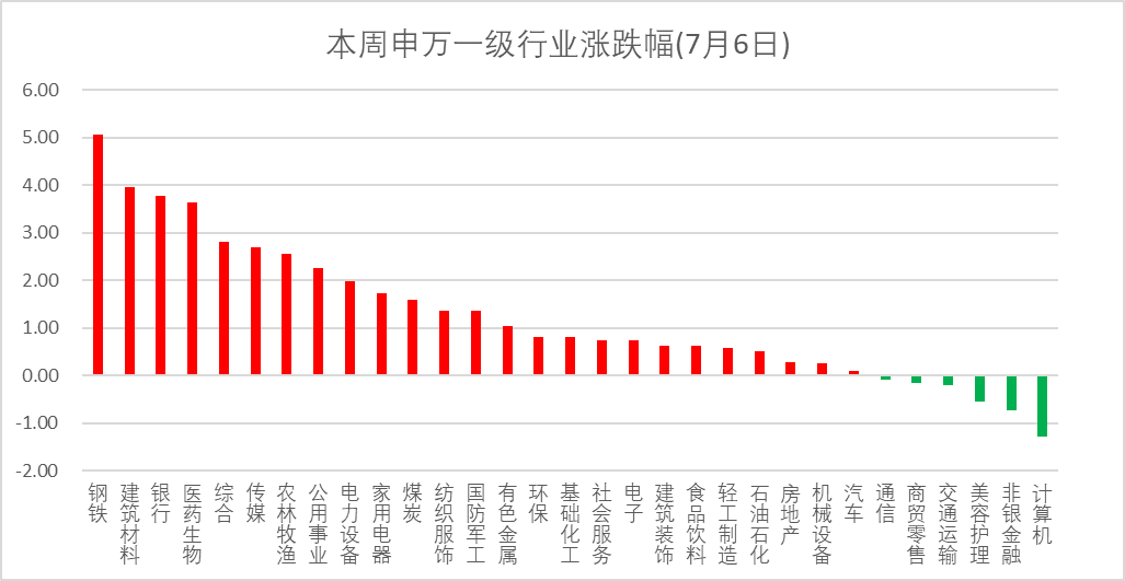 本周31个申万一级行业大多上涨,仅有六个行业下跌。钢铁、建筑材料、银行和医药生物涨幅居前,上涨幅度均超过了3%;计算机、非银金融和美容护理有所下跌,但跌幅有限。