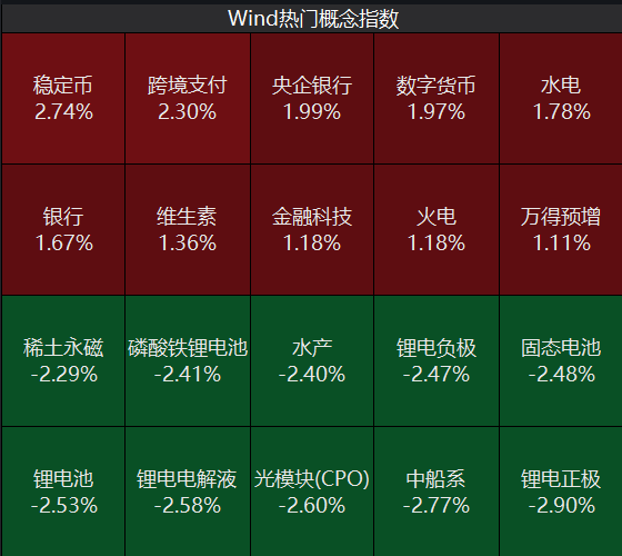 热点概念板块来看,本周稳定币、跨境支付等概念表现强势,上涨幅度超过2%;锂电相关、光模块和中船系等板块回调较多,跌幅超过2%。