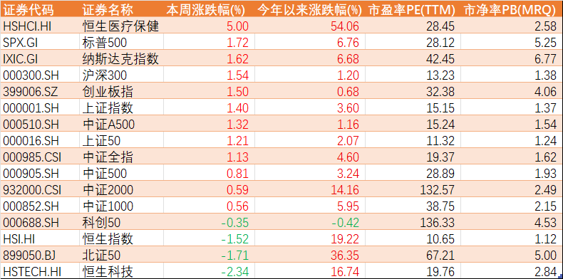 从市场风格来看,权重板块更加强势,拉动权重指数明显上涨,其中沪深300上涨1.54%,中证A500上涨1.32%;小微盘股票本周冲高后回落明显,表现不如大盘权重股。北证50全周下跌1.71%,科创50指数下跌0.34%。