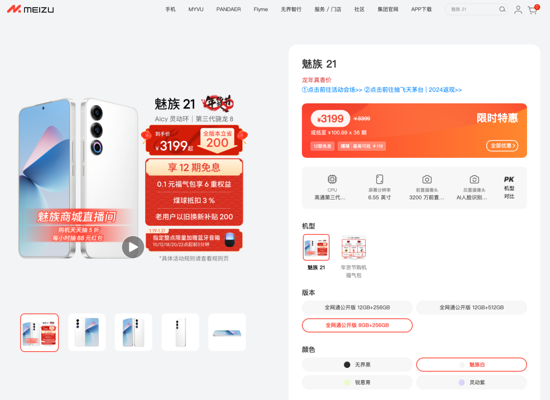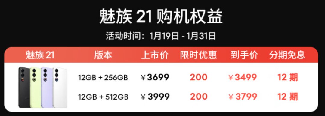 据了解,魅族21在1月19日-1月31日期间限时优惠200元,8+256GB版从3399元降为3199元(武汉地区JD无货、但官网有货),12+256GB版从3699元降为3499元,12+512GB版从3999元降为3799元。