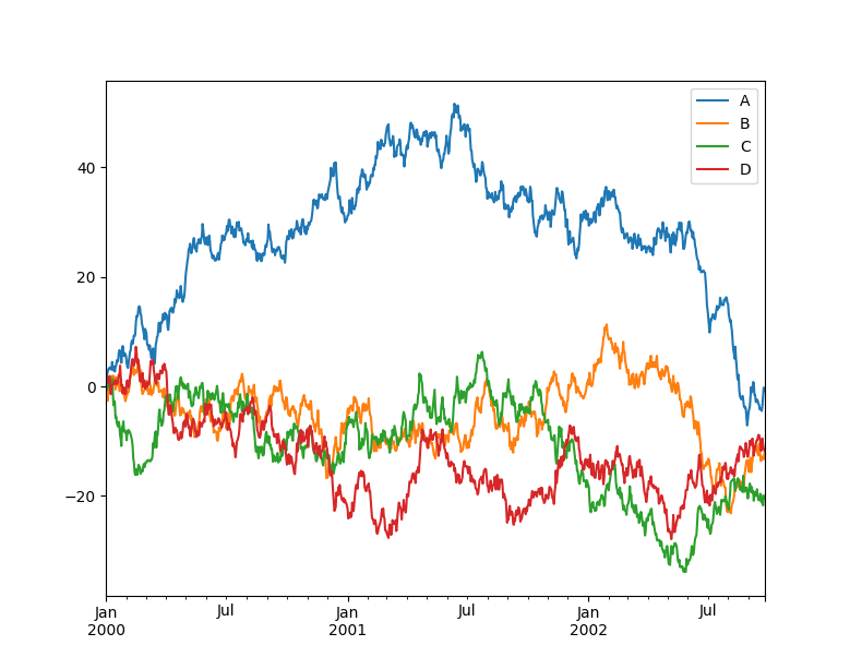 import matplotlib.pyplot as pltimport pandas as pdimport numpy as npts = pd.Series(np.random.randn(1000), index=pd.date_range("1/1/2000", periods=1000))ts = ts.cumsum()df = pd.DataFrame(np.random.randn(1000, 4), index=ts.index, columns=list("ABCD"))df = df.cumsum()df.plot()plt.show()