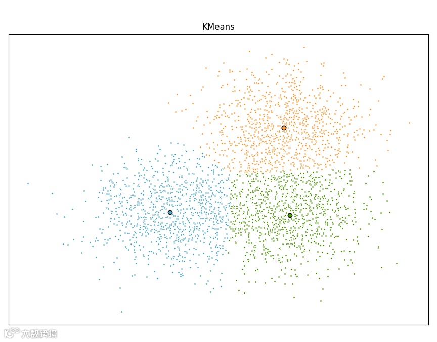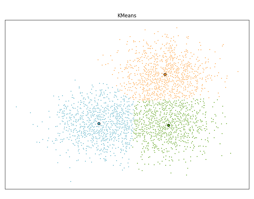 import timeimport numpy as npimport matplotlib.pyplot as pltfrom sklearn.cluster import MiniBatchKMeans, KMeansfrom sklearn.metrics.pairwise import pairwise_distances_argminfrom sklearn.datasets import make_blobs# Generate sample datanp.random.seed(0)batch_size = 45centers = [[1, 1], [-1, -1], [1, -1]]n_clusters = len(centers)X, labels_true = make_blobs(n_samples=3000, centers=centers, cluster_std=0.7)# Compute clustering with Meansk_means = KMeans(init='k-means++', n_clusters=3, n_init=10)t0 = time.time()k_means.fit(X)t_batch = time.time() - t0# Compute clustering with MiniBatchKMeansmbk = MiniBatchKMeans(init='k-means++', n_clusters=3, batch_size=batch_size,n_init=10, max_no_improvement=10, verbose=0)t0 = time.time()mbk.fit(X)t_mini_batch = time.time() - t0# Plot resultfig = plt.figure(figsize=(8, 3))fig.subplots_adjust(left=0.02, right=0.98, bottom=0.05, top=0.9)colors = ['#4EACC5', '#FF9C34', '#4E9A06']# We want to have the same colors for the same cluster from the# MiniBatchKMeans and the KMeans algorithm. Let's pair the cluster centers per# closest one.k_means_cluster_centers = k_means.cluster_centers_order = pairwise_distances_argmin(k_means.cluster_centers_,mbk.cluster_centers_)mbk_means_cluster_centers = mbk.cluster_centers_[order]k_means_labels = pairwise_distances_argmin(X, k_means_cluster_centers)mbk_means_labels = pairwise_distances_argmin(X, mbk_means_cluster_centers)# KMeansfor k, col in zip(range(n_clusters), colors):my_members = k_means_labels == kcluster_center = k_means_cluster_centers[k]plt.plot(X[my_members, 0], X[my_members, 1], 'w',markerfacecolor=col, marker='.')plt.plot(cluster_center[0], cluster_center[1], 'o', markerfacecolor=col,markeredgecolor='k', markersize=6)plt.title('KMeans')plt.xticks(())plt.yticks(())plt.show()