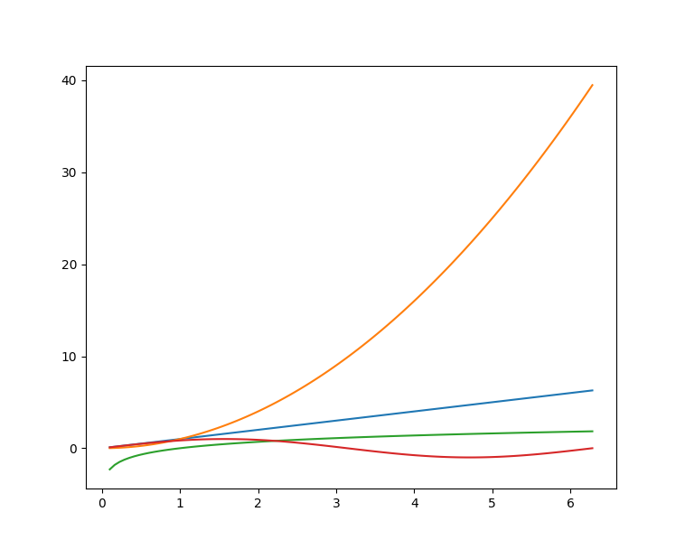 # plot_multi_curve.pyimport numpy as npimport matplotlib.pyplot as pltx = np.linspace(0.1, 2 * np.pi, 100)y_1 = xy_2 = np.square(x)y_3 = np.log(x)y_4 = np.sin(x)plt.plot(x,y_1)plt.plot(x,y_2)plt.plot(x,y_3)plt.plot(x,y_4)plt.show()