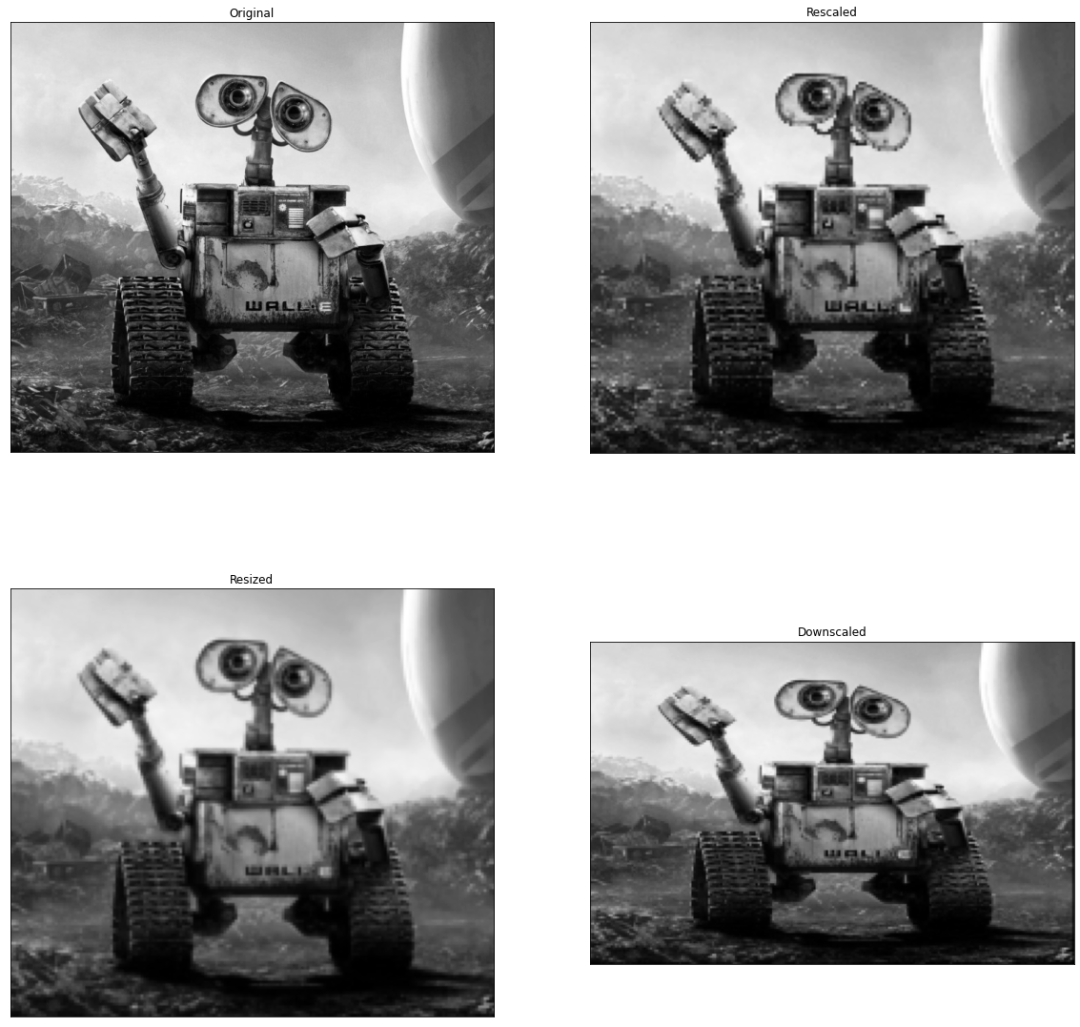 from skimage import data, color, iofrom skimage.transform import rescale, resize, downscale_local_meanimage = color.rgb2gray(io.imread('h89817032p0.png'))image_rescaled = rescale(image, 0.25, anti_aliasing=False)image_resized = resize(image, (image.shape[0] // 4, image.shape[1] // 4),anti_aliasing=True)image_downscaled = downscale_local_mean(image, (4, 3))plt.figure(figsize=(20,20))plt.subplot(221),plt.imshow(image, cmap='gray'),plt.title('Original')plt.xticks([]), plt.yticks([])plt.subplot(222),plt.imshow(image_rescaled, cmap='gray'),plt.title('Rescaled')plt.xticks([]), plt.yticks([])plt.subplot(223),plt.imshow(image_resized, cmap='gray'),plt.title('Resized')plt.xticks([]), plt.yticks([])plt.subplot(224),plt.imshow(image_downscaled, cmap='gray'),plt.title('Downscaled')plt.xticks([]), plt.yticks([])plt.show()