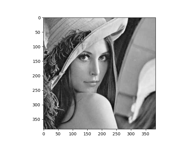 import numpy as npimport mahotasimport mahotas.demosfrom mahotas.thresholding import soft_thresholdfrom matplotlib import pyplot as pltfrom os import pathf = mahotas.demos.load('lena', as_grey=True)f = f[128:,128:]plt.gray()# Show the data:print("Fraction of zeros in original image: {0}".format(np.mean(f==0)))plt.imshow(f)plt.show()