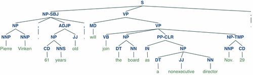 import nltkfrom nltk.corpus import treebank# 首次使用需要下载nltk.download('punkt')nltk.download('averaged_perceptron_tagger')nltk.download('maxent_ne_chunker')nltk.download('words')nltk.download('treebank')sentence = """At eight o'clock on Thursday morning Arthur didn't feel very good."""# Tokenizetokens = nltk.word_tokenize(sentence)tagged = nltk.pos_tag(tokens)# Identify named entitiesentities = nltk.chunk.ne_chunk(tagged)# Display a parse treet = treebank.parsed_sents('wsj_0001.mrg')[0]t.draw()