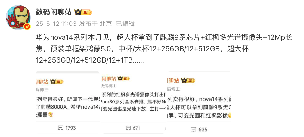 爆料将在本月发布的新机有多款型号,今天华为nova 14系列也有更多消息。