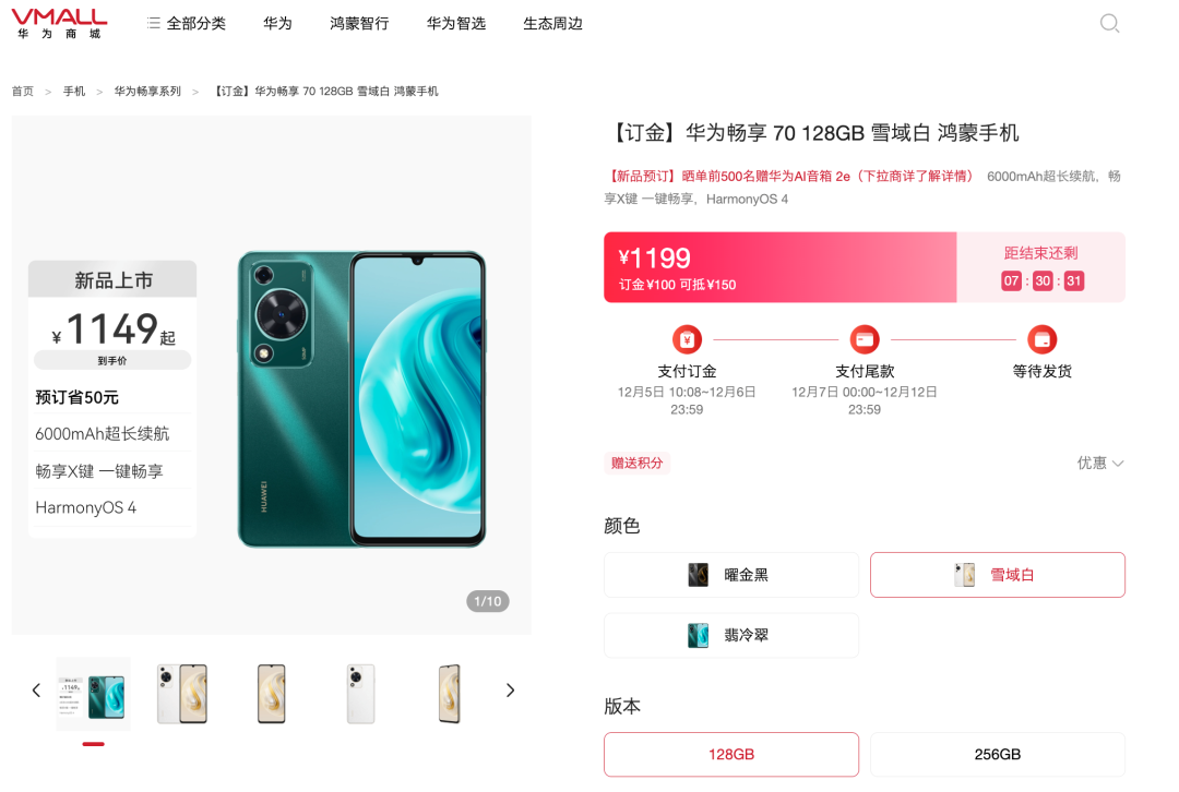 价格上,华为畅享70:128GB版售价1199元(参与预订到手价1149元),256GB版1399元(参与预订到手价1349元),目前已开启预订,将于12月7日支付尾款。大家觉得这外观配置价格如何?