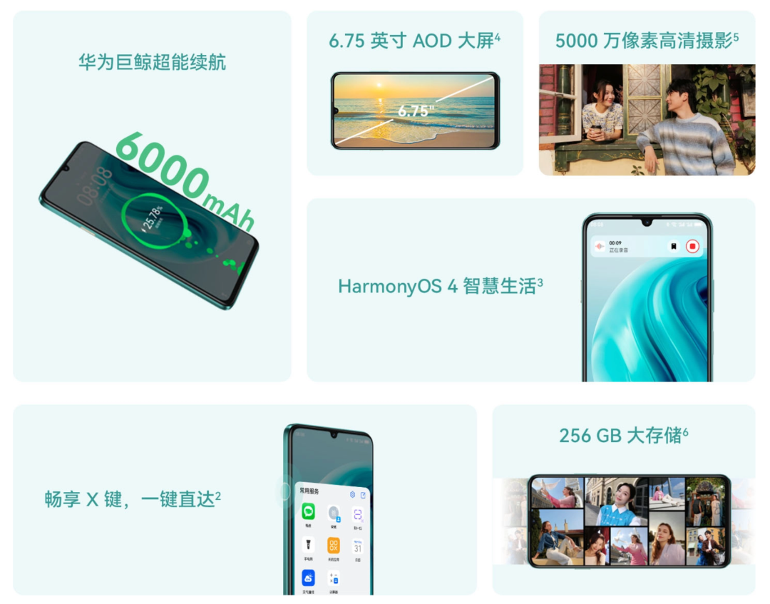 核心配置上,华为畅享70前置8MP,后置50MP+2MP,处理器官网没写(网传是麒麟710A 4G),配备6000mAh电池,22.5W充电,机身左侧有颗「畅享X键」一键直达App,后续可OTA HarmonyOS 4,不支持NFC。