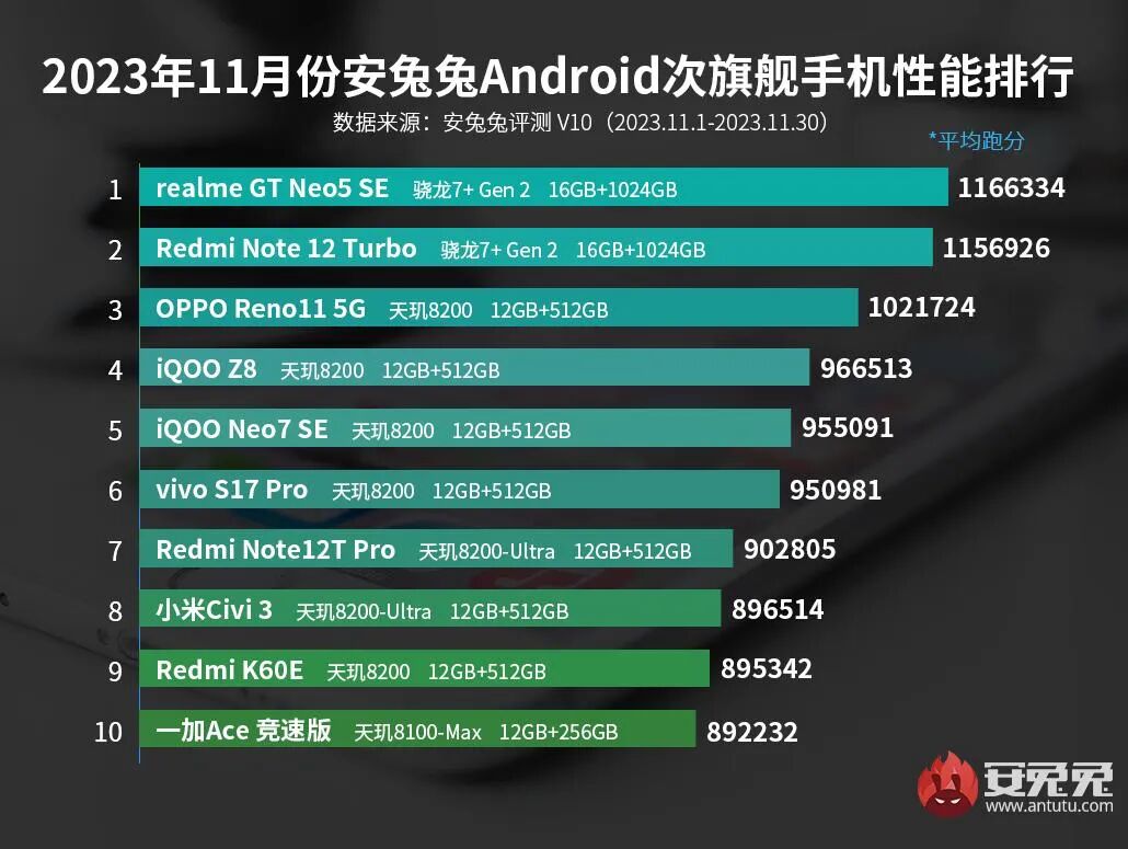 至于安卓次旗舰TOP 10则依然是老样子,骁龙7+ Gen2两颗独苗苗:真我GT Neo5 SE和Redmi Note 12 Turbo地位稳固,跑分超出后面一众天玑8200机型20W+。虽说跑分不代表一切,但也能体现性能,当然了,最终还是体验最重要,这份榜单供大家参考。