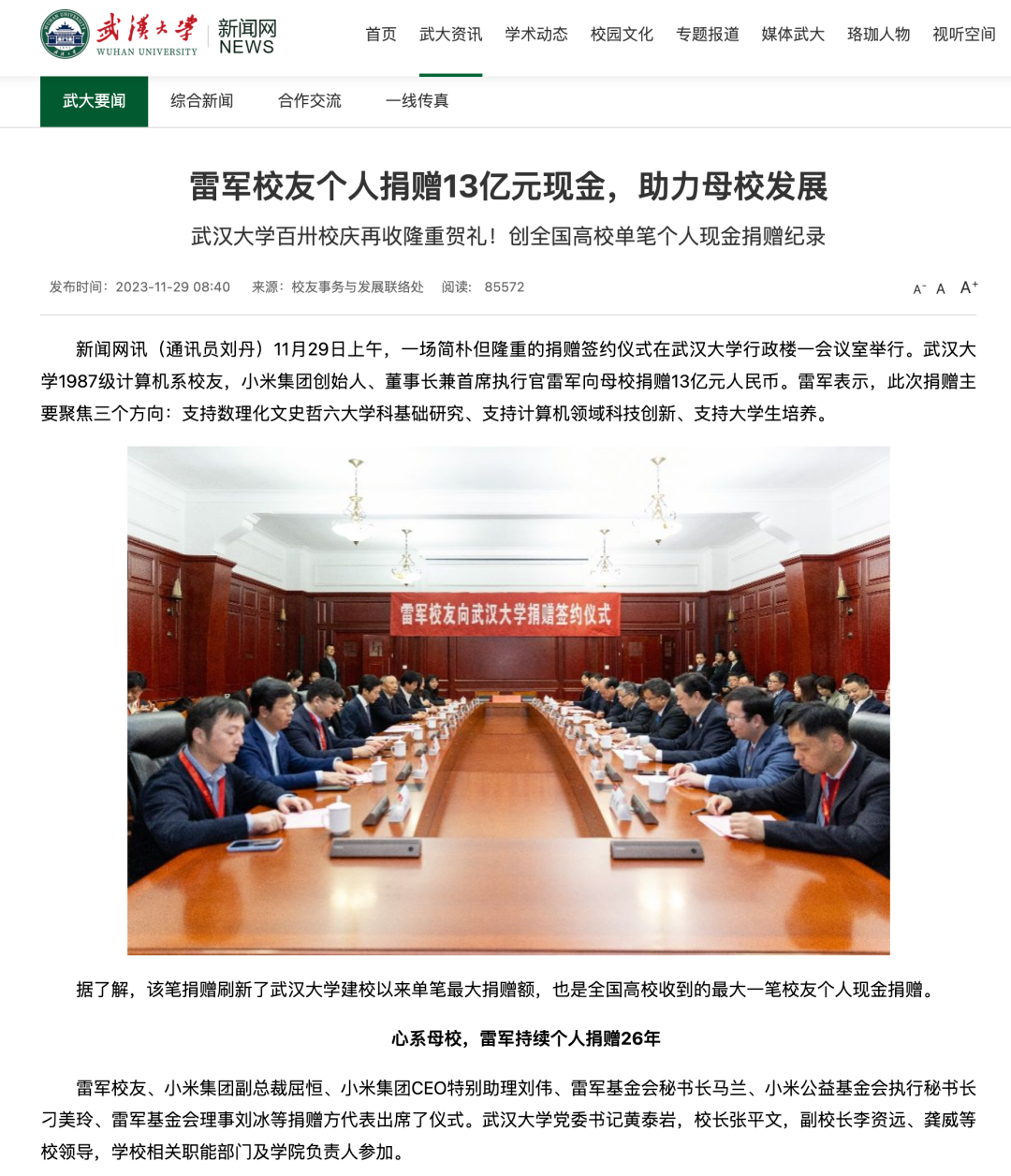 作为补充,11月29日武汉大学130周年校庆之际,雷军作为武汉大学1987级计算机系校友向母校捐赠13亿元人民币,该笔捐赠刷新了武汉大学建校以来单笔最大捐赠额,也是全国高校收到的最大一笔校友个人现金捐赠。雷军在致辞中还表示:“这么多年来,我时时都想起母校给我的支持,内心始终充满感激”。“希望通过自己的一点点绵薄之力,支持武大在未来的日子里创造更辉煌的历史,让中国出现更多的优秀的工程师、科学家和科技创业者。”