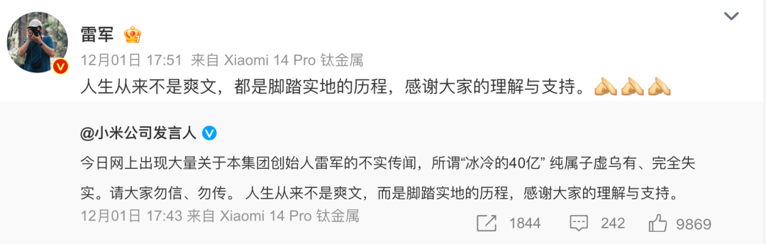 随后小米公司发言人和雷军在微博表示:「今日网上出现大量关于本集团创始人雷军的不实传闻,所谓“冰冷的40亿” 纯属子虚乌有、完全失实。请大家勿信、勿传。 人生从来不是爽文,而是脚踏实地的历程,感谢大家的理解与支持。」从金山到天使投资人,再到创办小米,确实都是一步步走来。