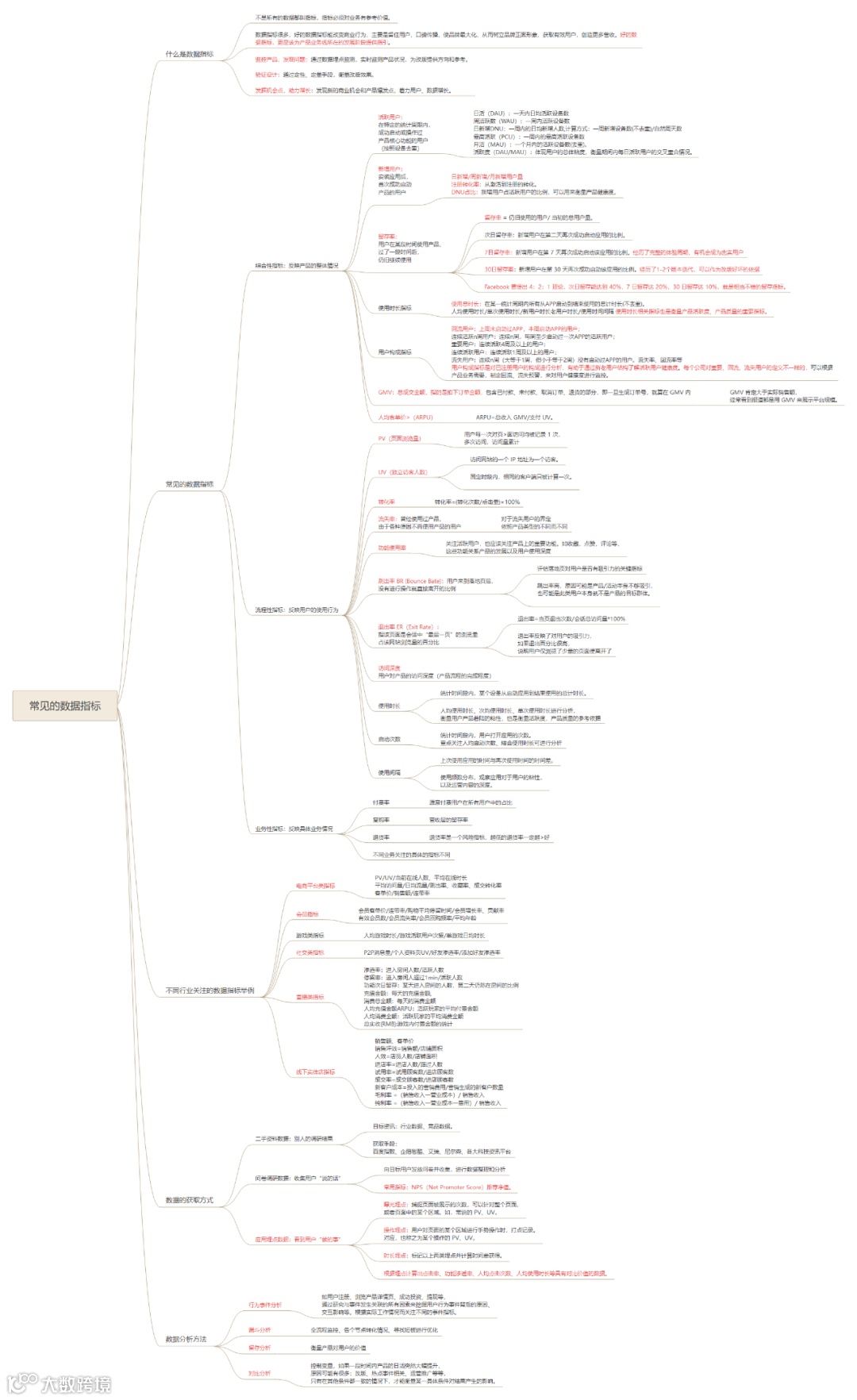 常见的数据指标有3种:反映产品整体情况的综合性指标、反映用户使用行为的流程性指标和反映具体业务情况的业务性指标。不同行业关注的数据情况不同,数据获取方式也有很多种,具体有哪些方式和不同,你可以通过这张图找到答案。